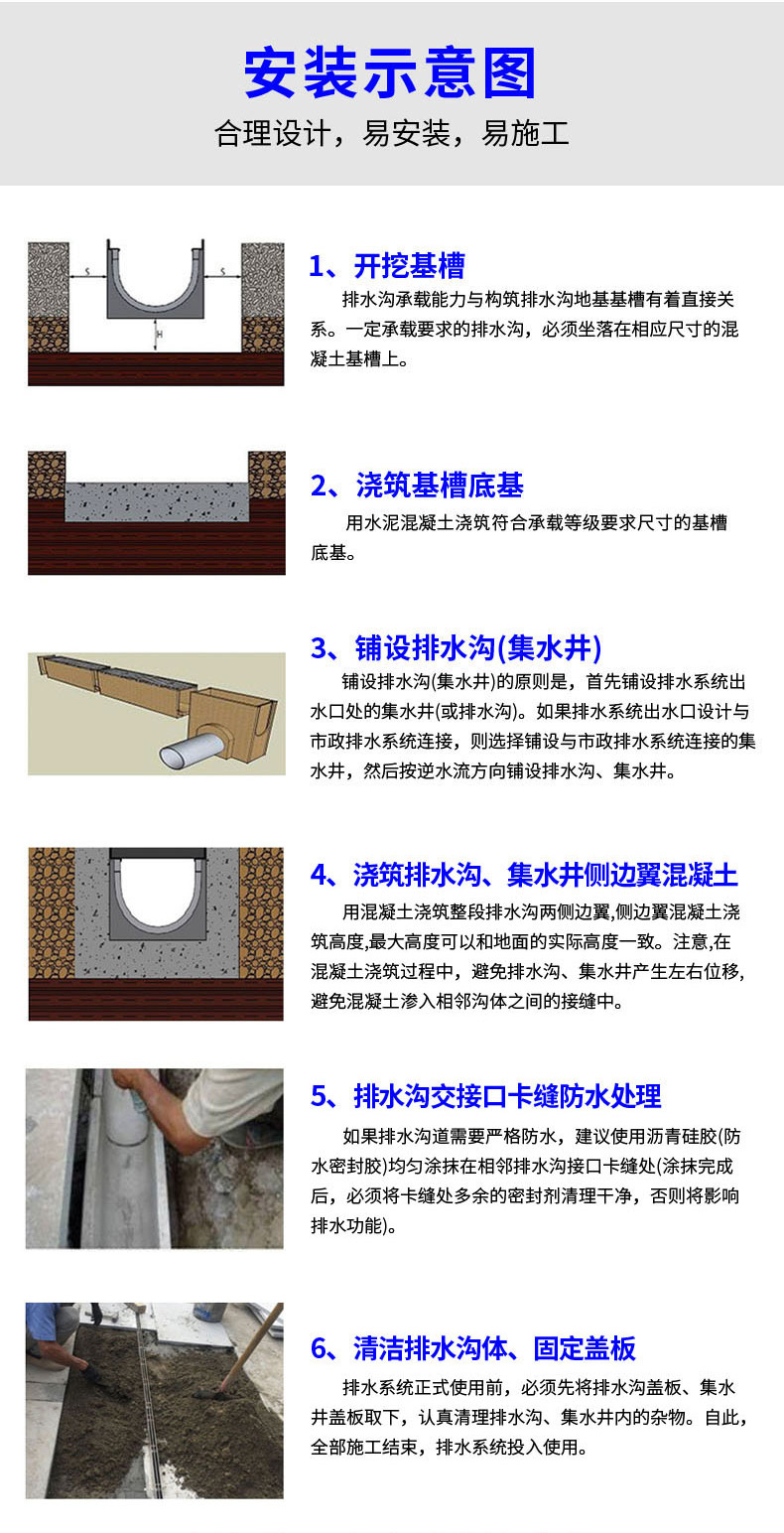【盖板类型及材料】:可搭配树脂复合盖板、铸铁盖板、不锈钢缝隙式盖板、镀锌钢格栅等